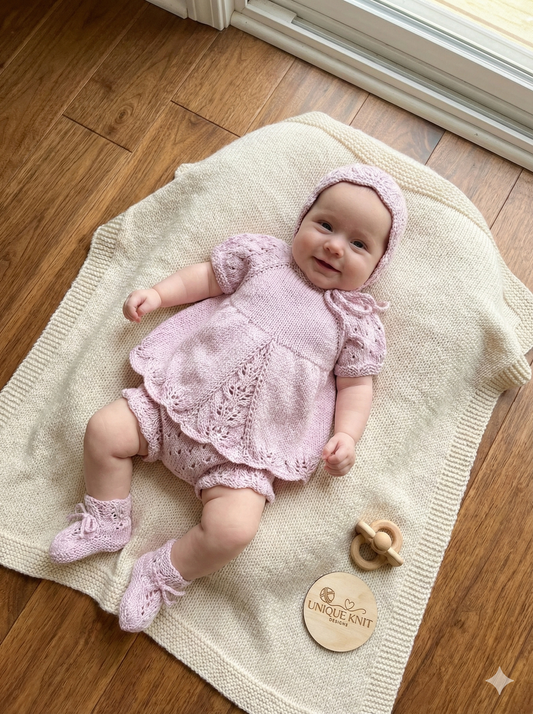 "Meadow” Romper and Dress set Knitting pattern for Reborn doll 16 -22” or 0-3 Mth Old Baby