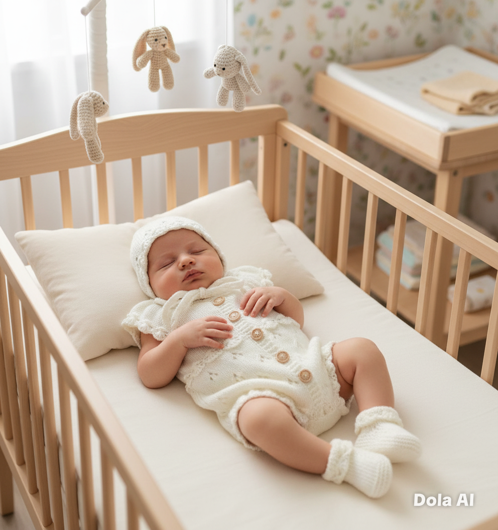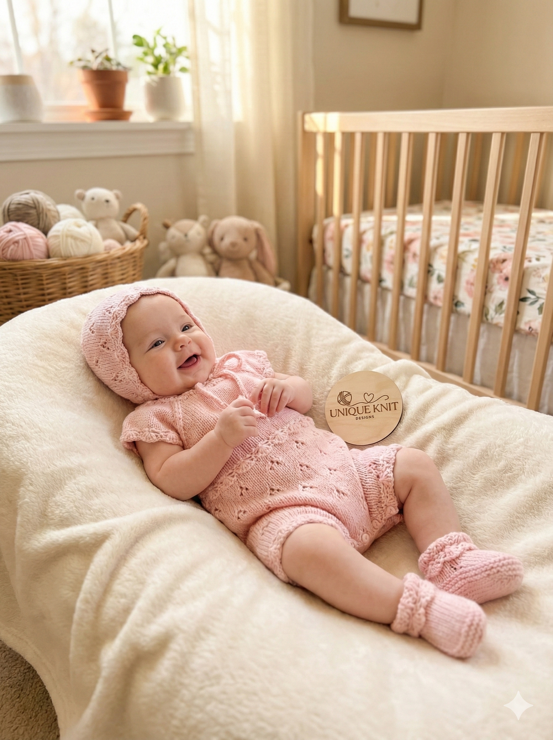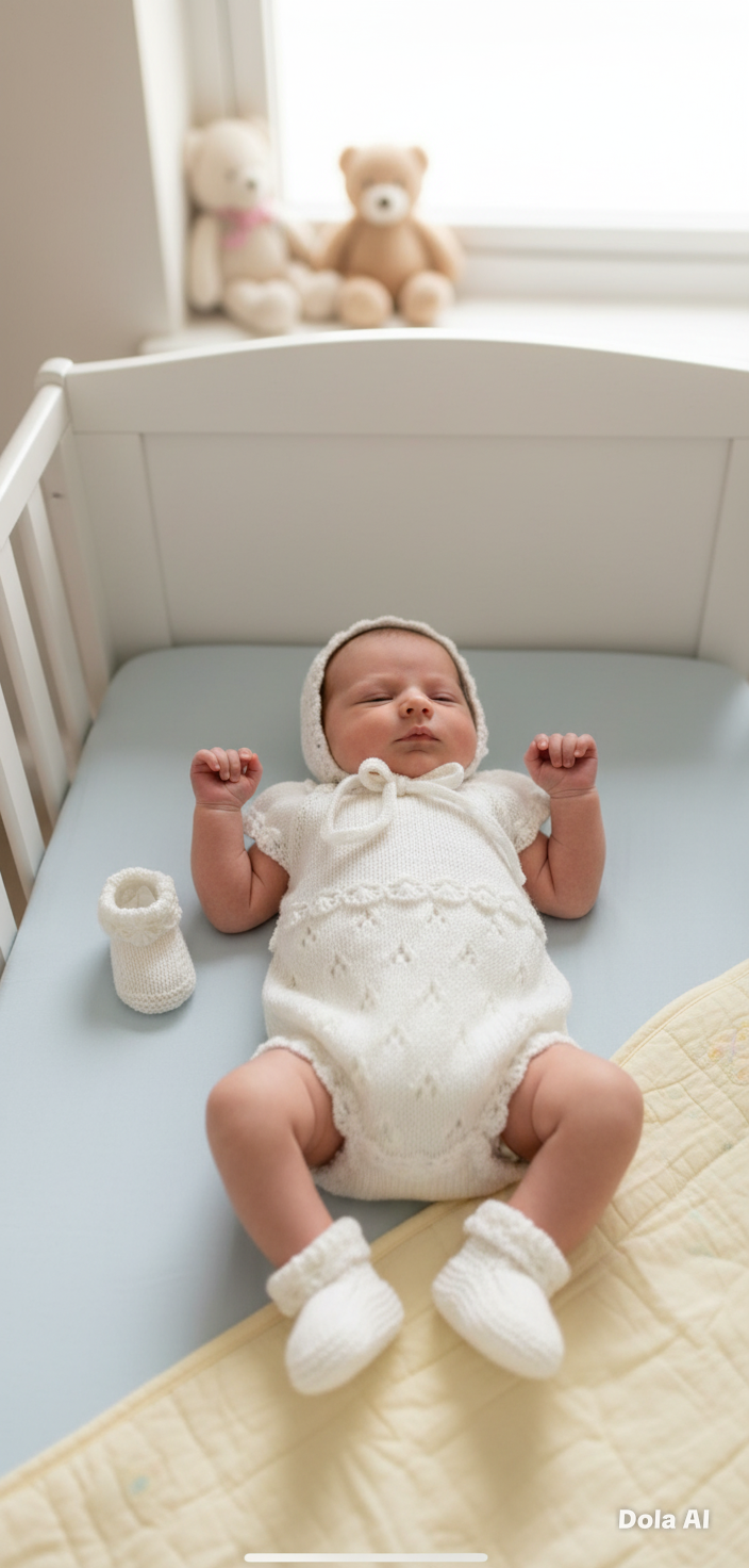• Finishing Touches: The front features a full-length button placket for easy dressing, and the matching bonnet uses knitted ties for a secure, comfortable fit.