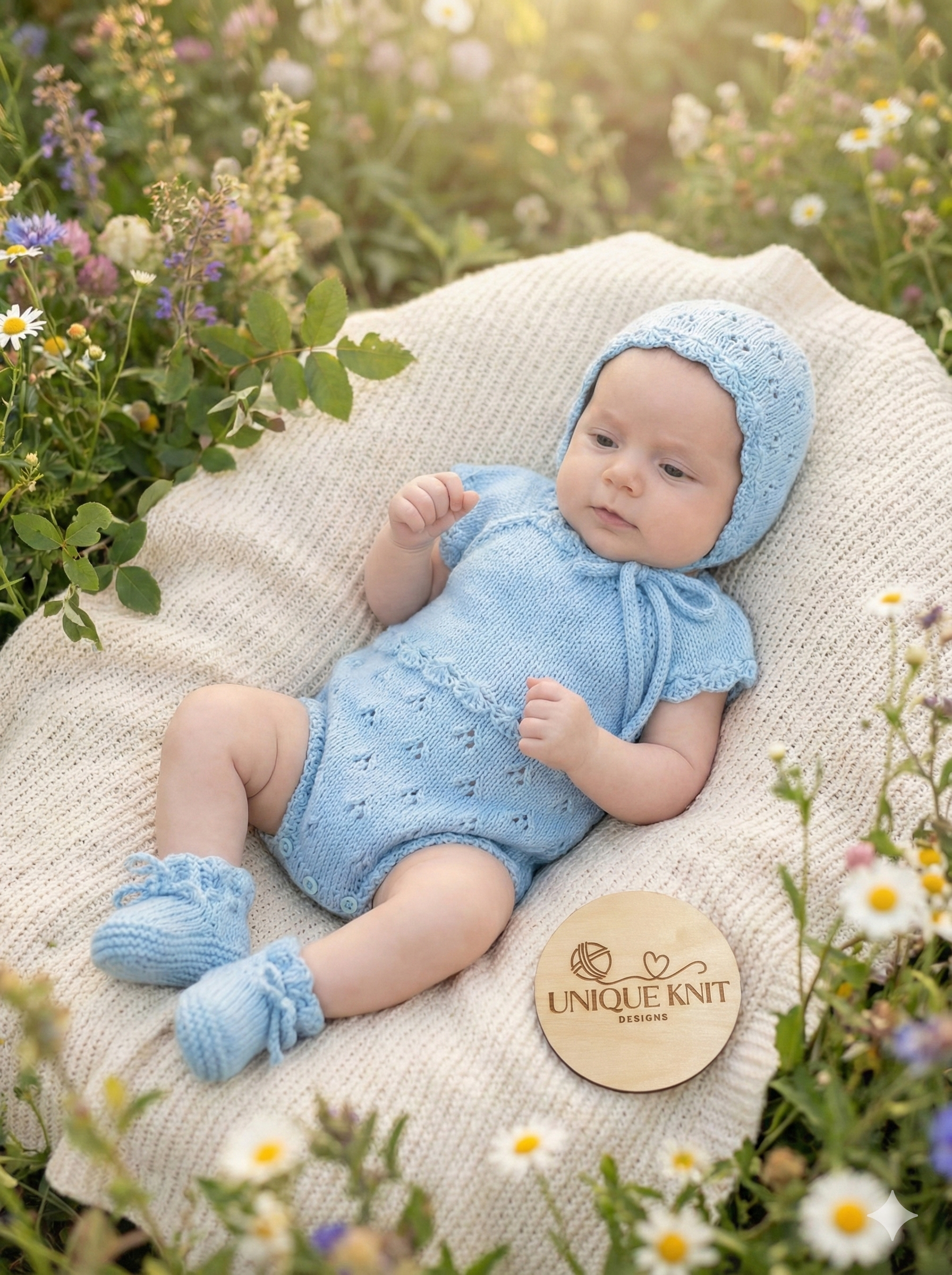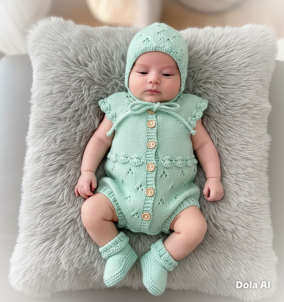 This charming knitted baby set features a delicate, vintage-inspired design that is as practical as it is beautiful. Perfectly sized for newborns (0–3 months), the ensemble includes a textured romper, a matching bonnet, and cozy booties.