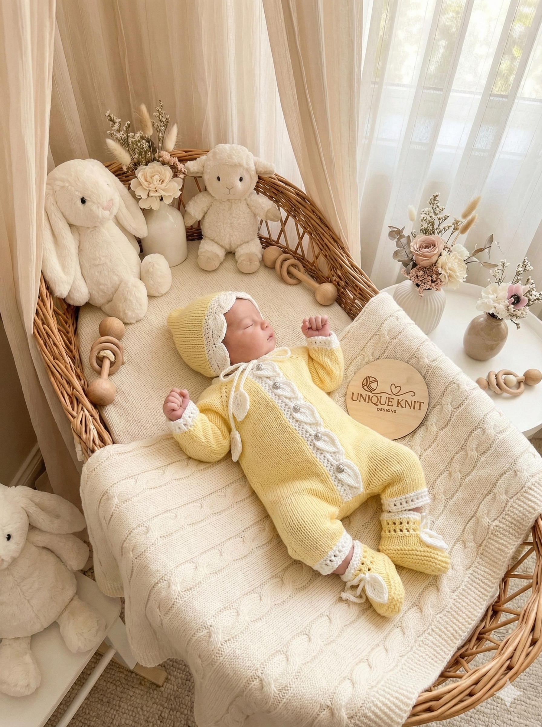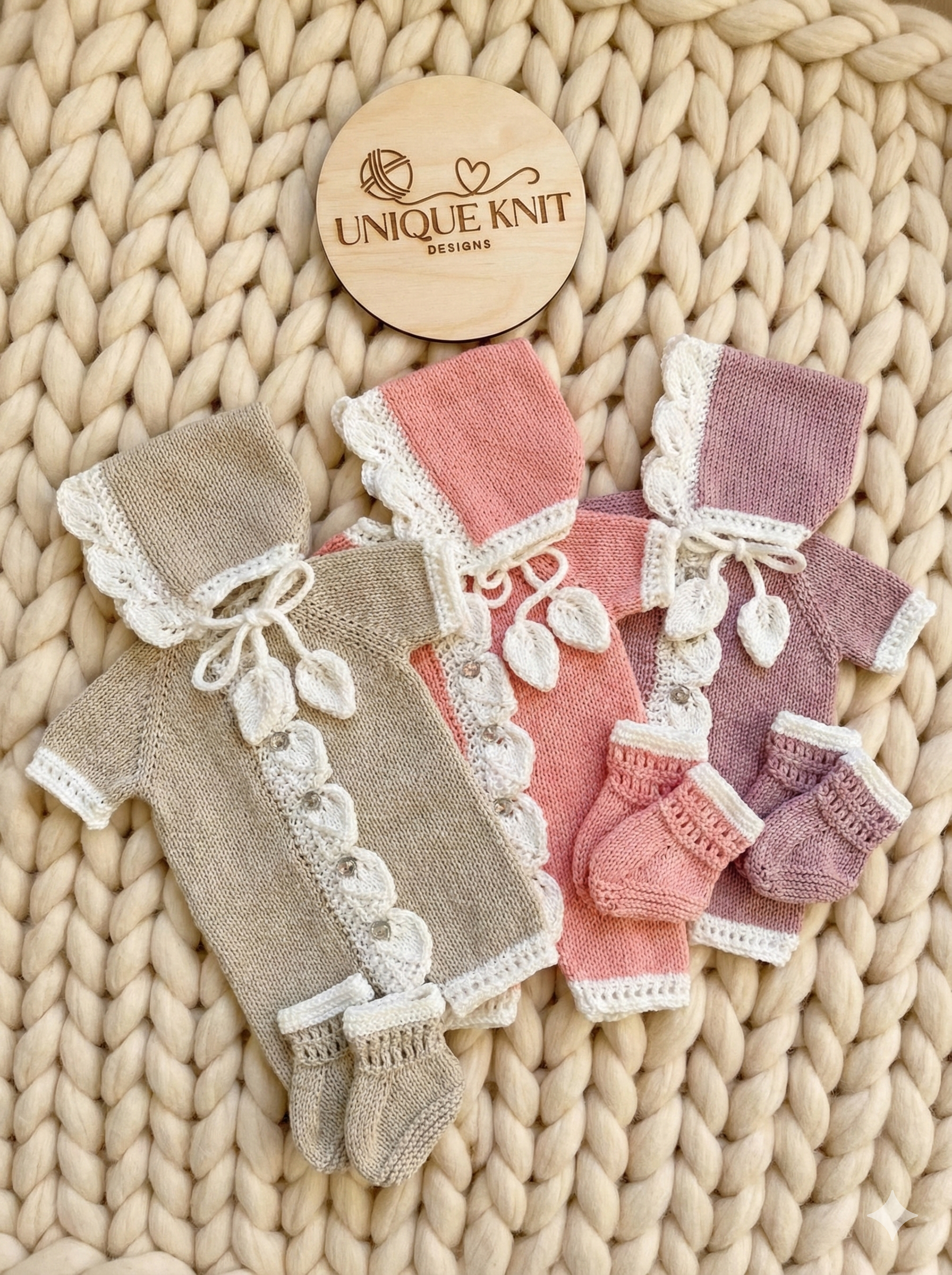 This exquisite three-piece set—featuring a romper, bonnet, and booties—is designed with both elegance and ease of construction in mind. Tailored for infants aged 0 to 3 months, the pattern offers a high-end "boutique" look through clever architectural knitting techniques.