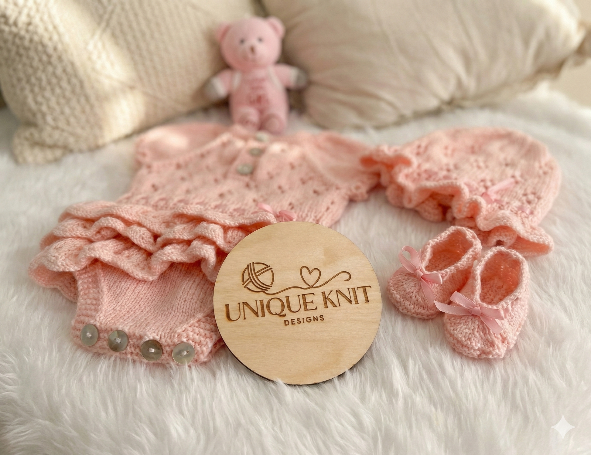 A beautiful romper set. The romper is knitted from the neck down on single pointed needles so requires minimum sewing and no seams making it nice and comfy for the baby. The shoes and sunhat beautifully compliment the romper