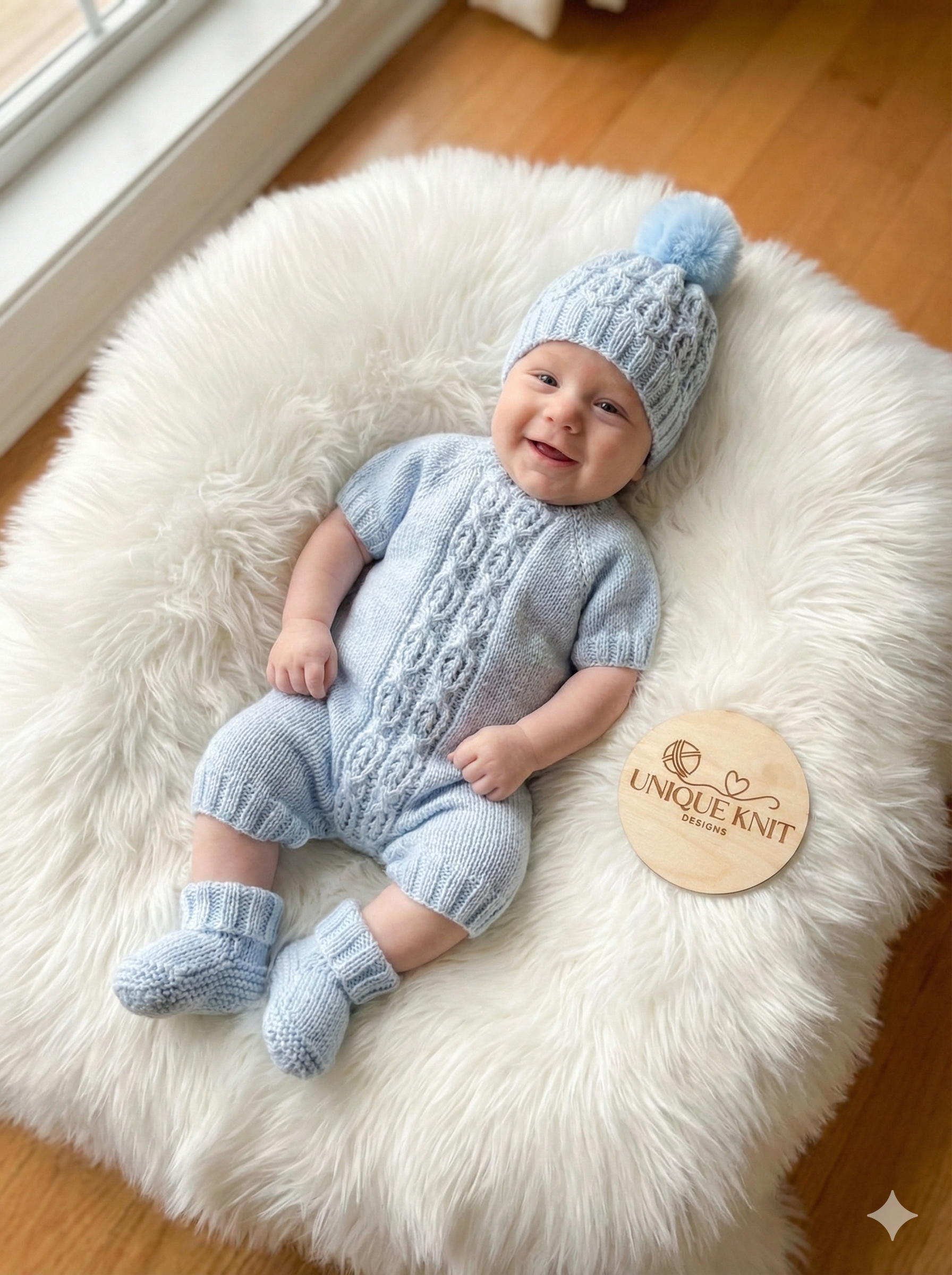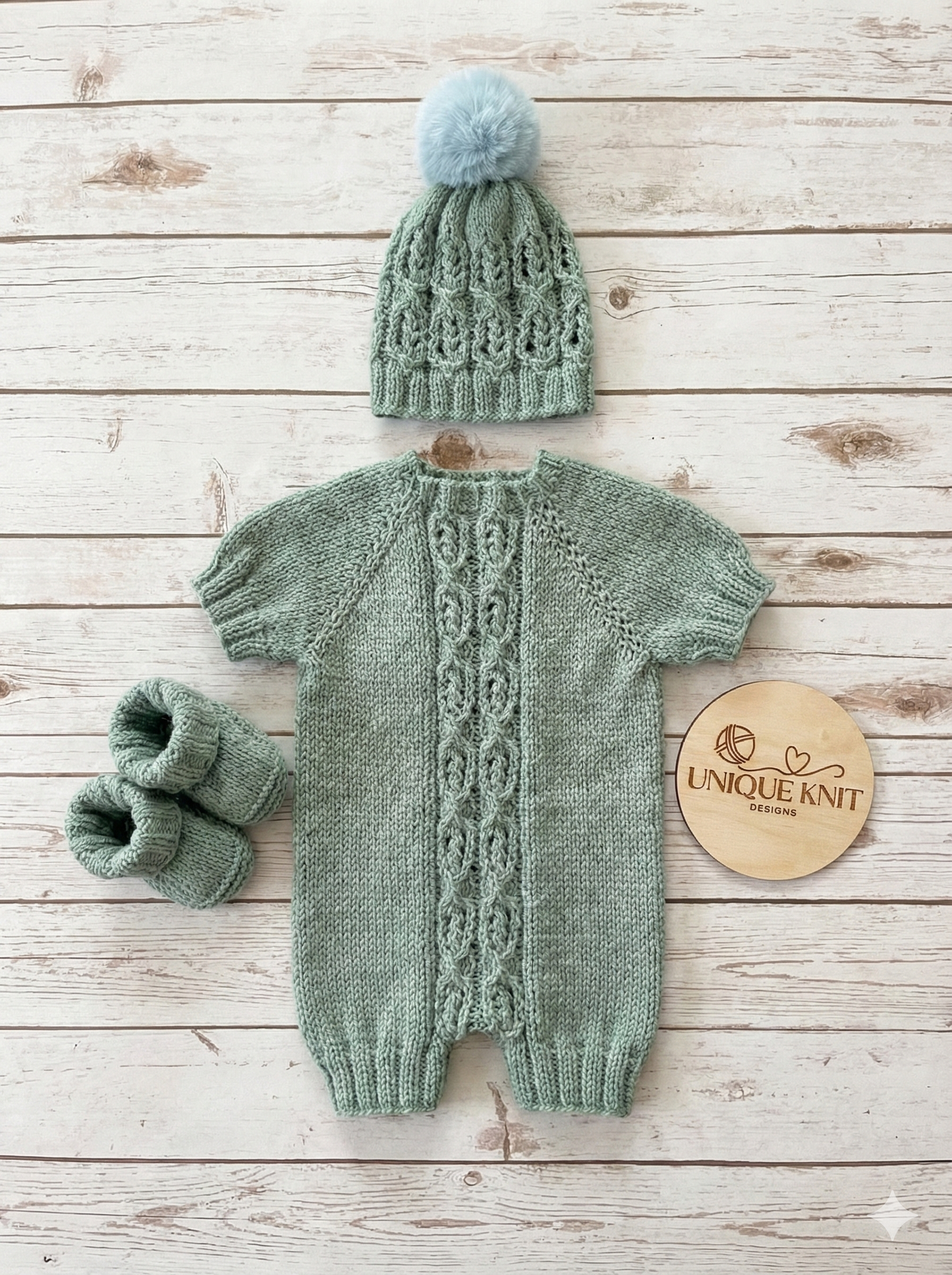 A beautiful 3 piece Romper set knitted with an off centre opening.