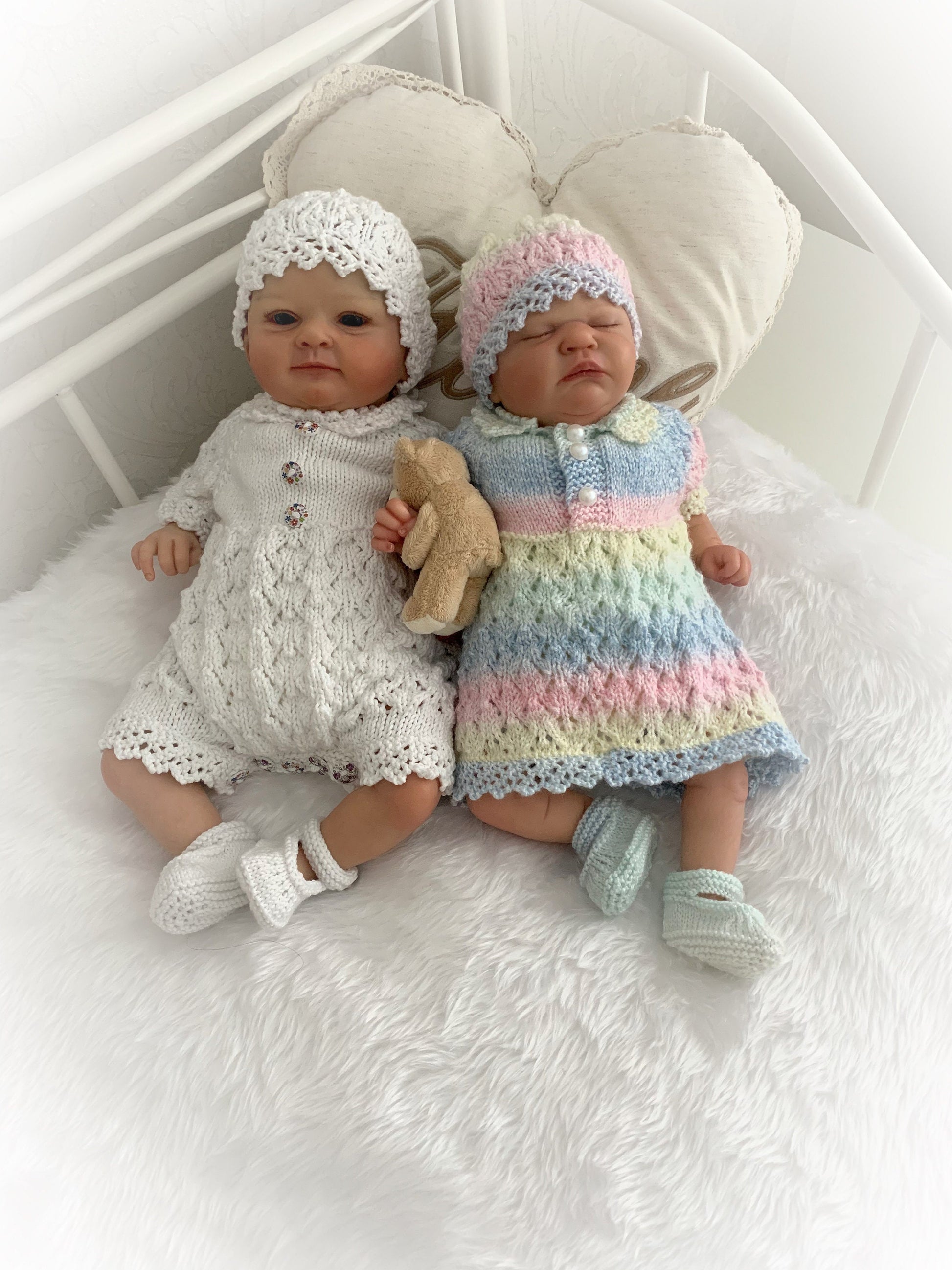This knitting pattern provides the instructions to make both sets. The romper set includes a beanie hat and shoes, plus the dress set which includes the instructions for the beanie hat, frilly lace bloomers and shoes.