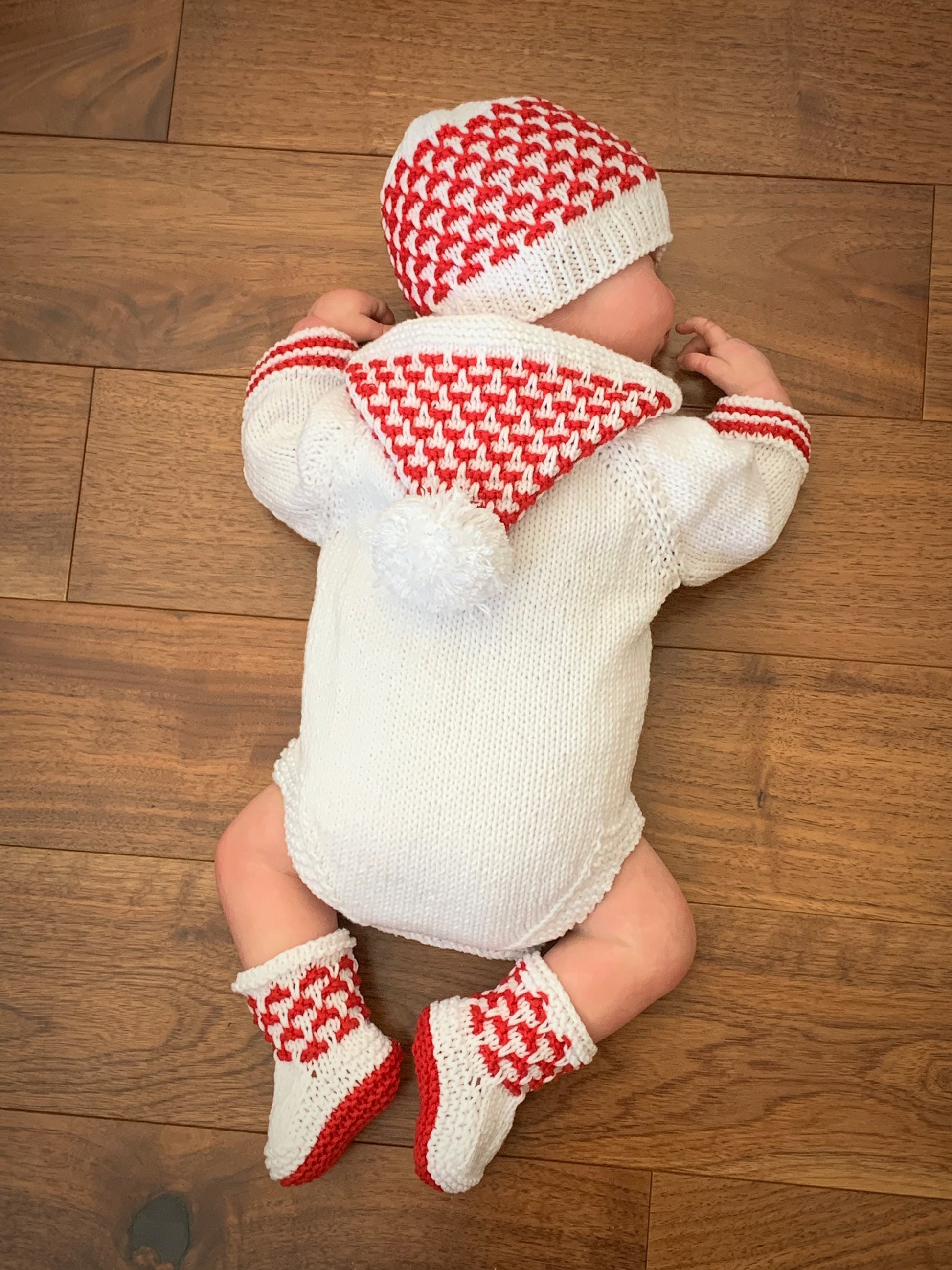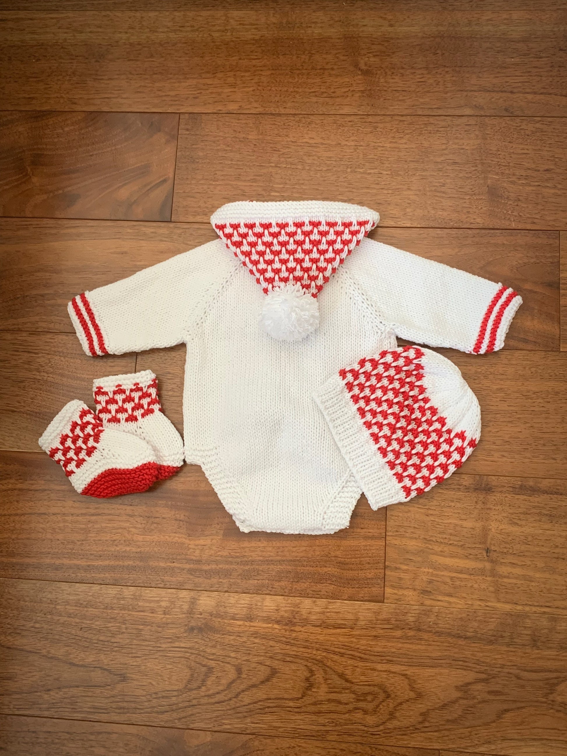 This hooded romper is knitted from the hood down, the textured hood design is a simple two-colour slip stitch that is easy to do. The pattern has line-by-line instructions for the complete set of Romper, hat, and booties.