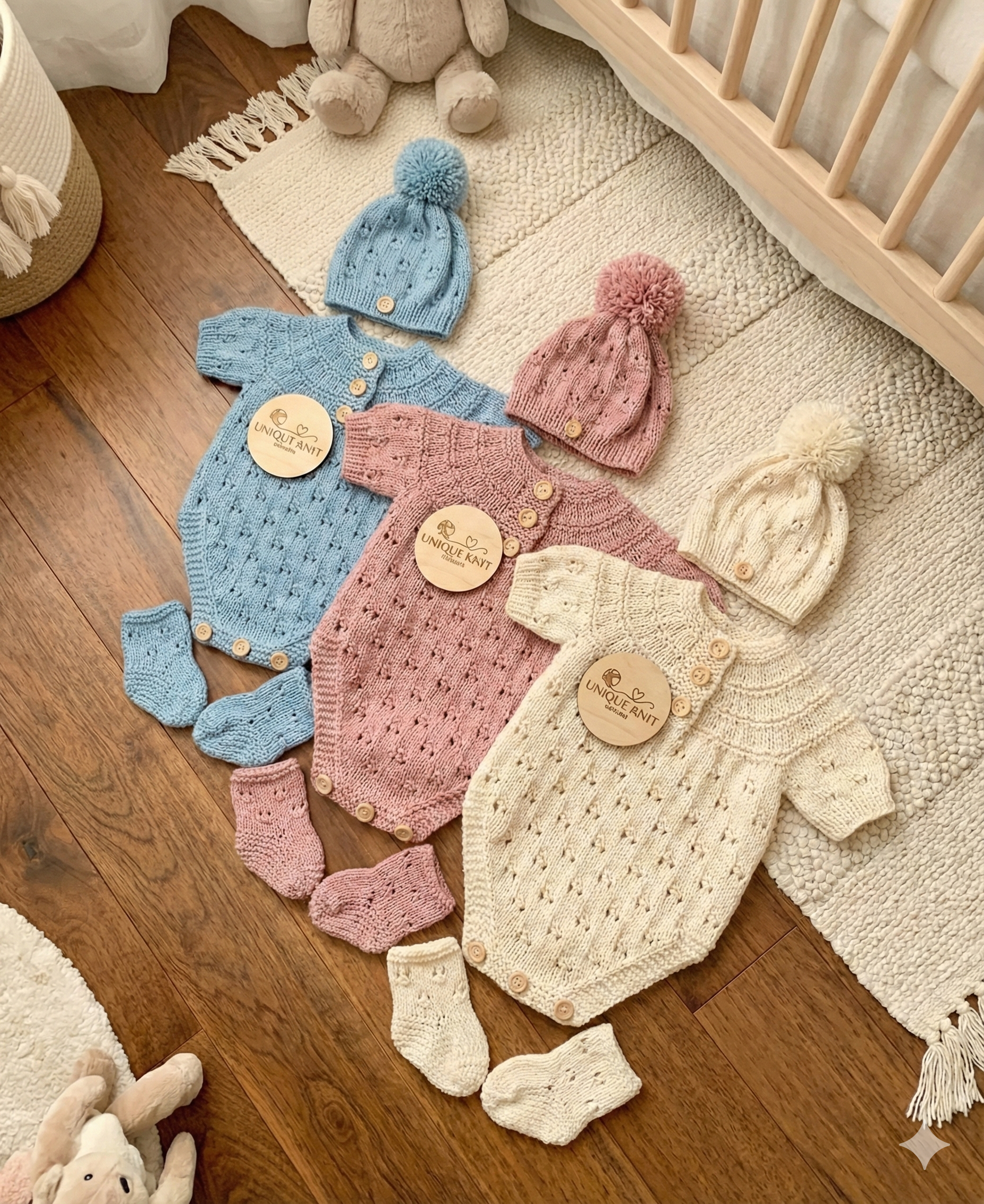 This sweet modern 3-piece Romper design features a textured yoke and an easy eyelet pattern which is then replicated on the hat and booties. The set is knitted from the top down using straight needles and knitted back and forth. meaning very little sewing is required and fewer seams.