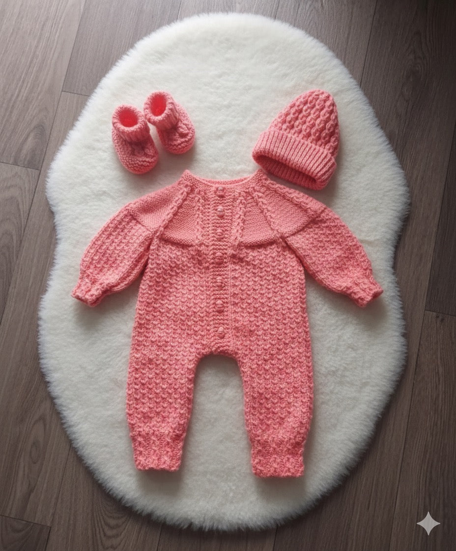 A practical romper set knitted from the neck down on single pointed needles. Requires minimum sewing and no seams making it nice and comfy for the baby. The simple stitches used makes the pattern easy to memorise, making it the perfect outfit to knit whilst watching TV.