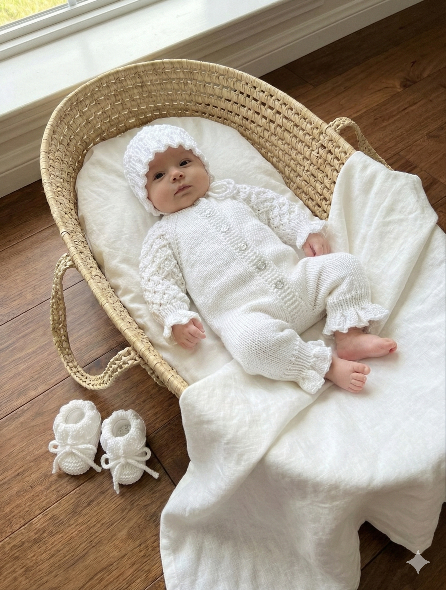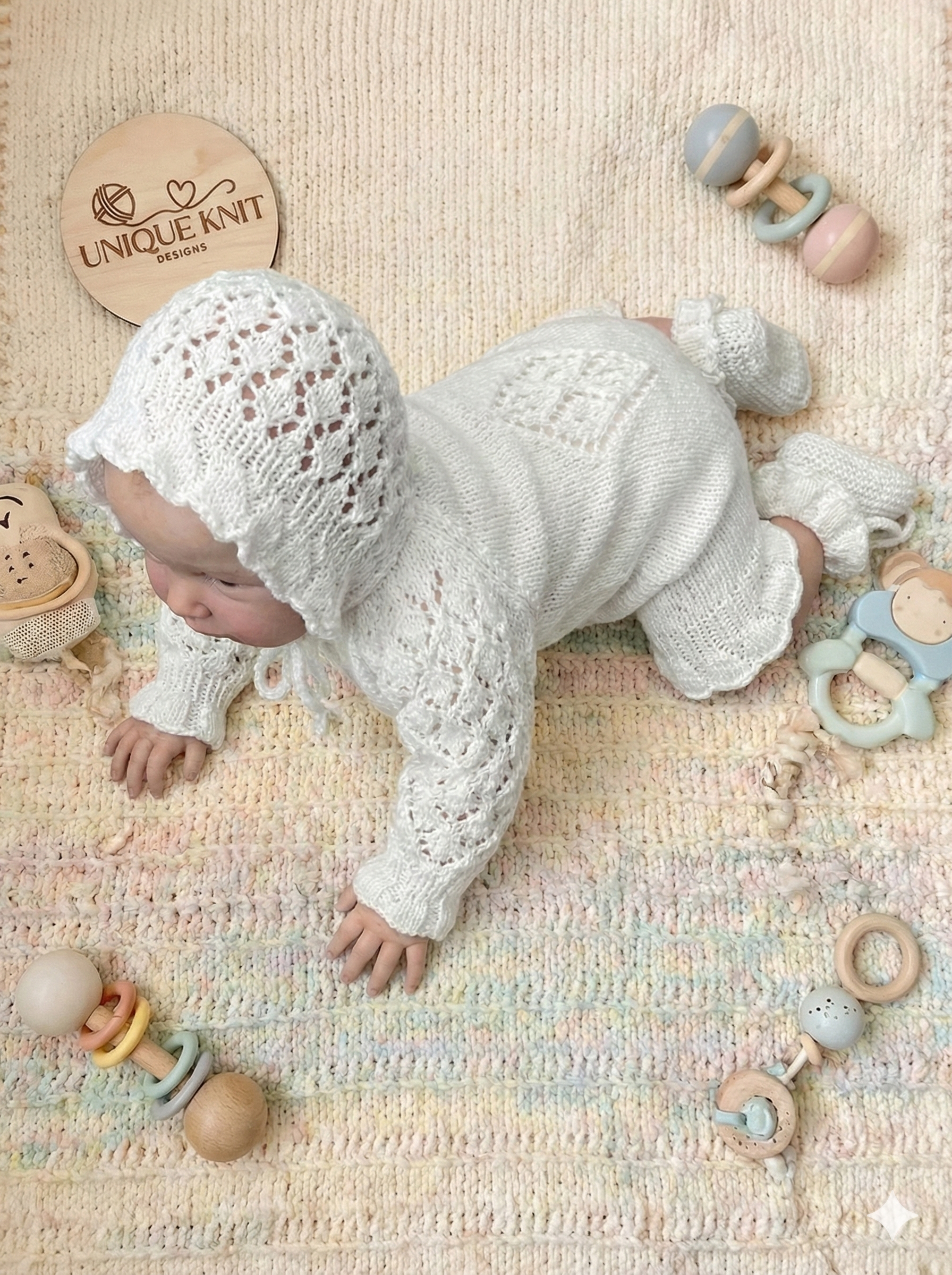 The bonnet is knitted from the top down. The little booties are knitted on two needles back and forth and are also quick to knit up and complete this beautiful little set.