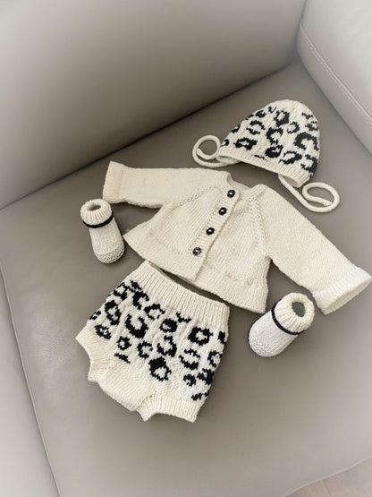 This pattern provides the instructions to make a 4 piece set, suitable for a 0-3 month old baby or a 16 - 22" Reborn doll, the size depends on the needles and yarn used. The details of which are in the pattern.