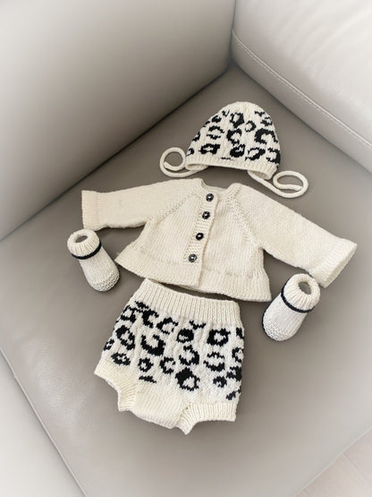 The peplum cardigan is knitted in one piece from the top down. The shorts are made using two identical pieces which are sewn together at the gusset and sides. The complete set is knitted using straight needles and two colours of yarns and has line by line instructions and also a colour chart for reference.