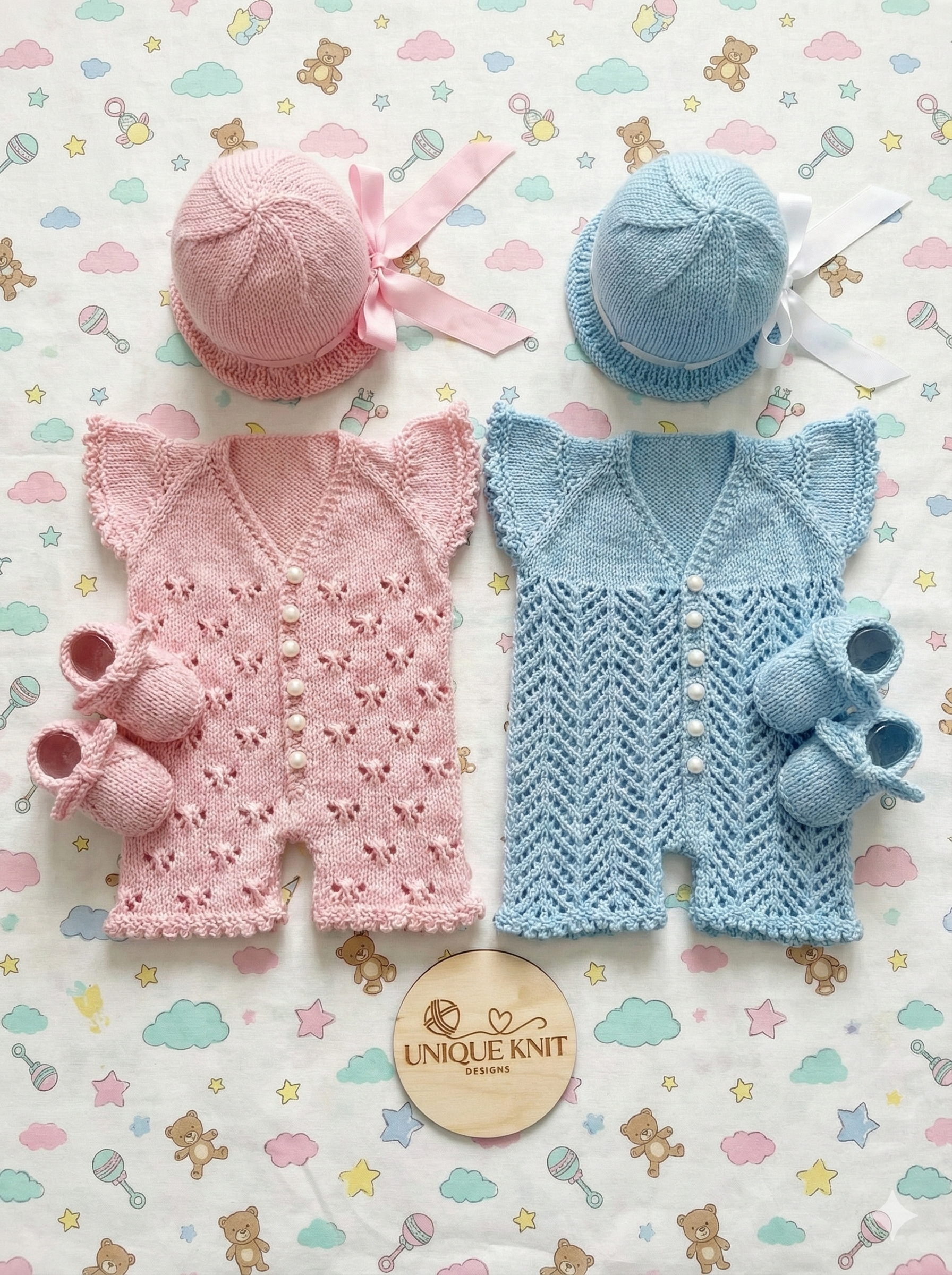As with all my designs, this set has line-by-line instructions. and is knitted on straight needles back and forth.