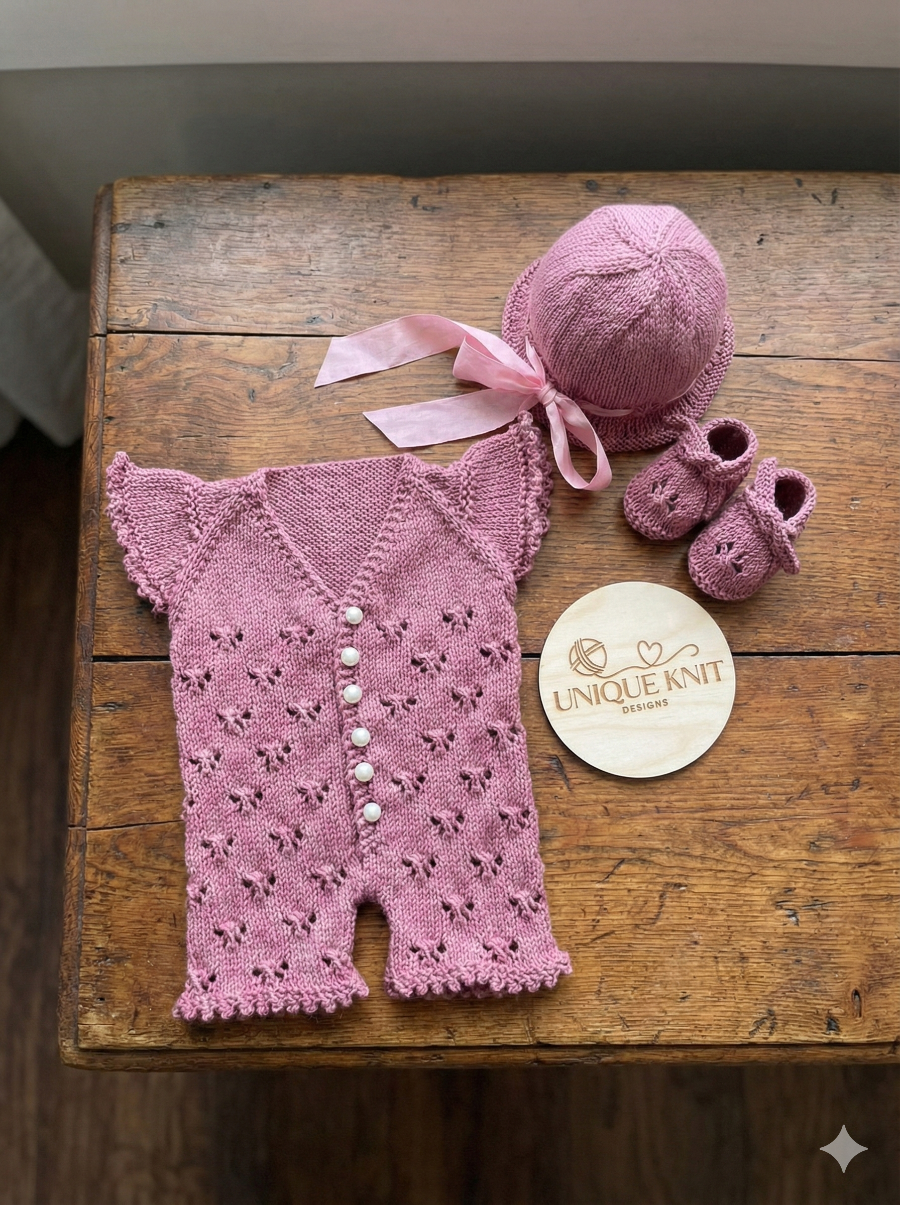 A beautiful 3 piece v- neck Playsuit set with a choice of two stitch design options. The Playsuit can be knitted in either a lace Chevron stitch or little bows stitch. The Playsuit is knitted from the top down with buttons to the front.