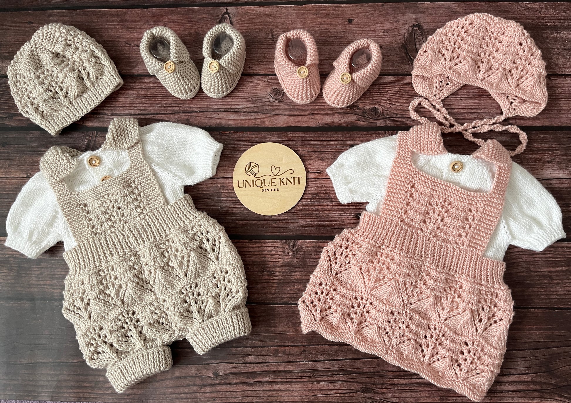 The whole set is knitted using straight needles going back and forth. It has line-by-line instructions and minimal sewing.