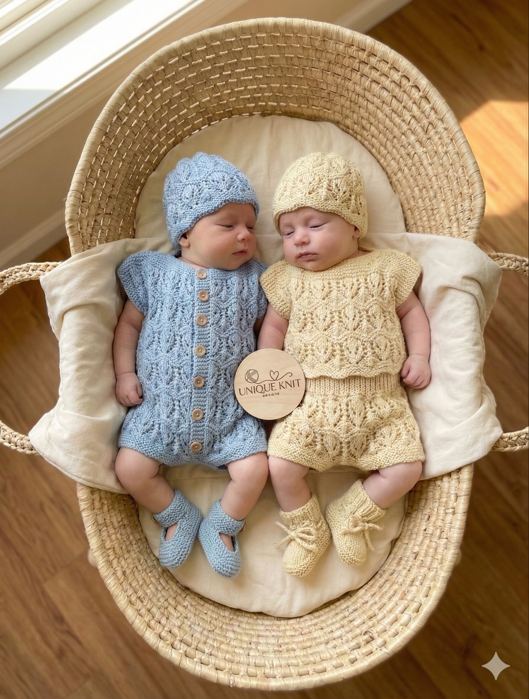 The whole set is knitted using straight needles going back and forth. It has line-by-line instructions and minimal sewing.